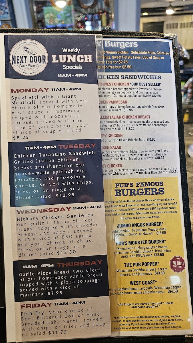 Welcome to Next Door Pub & Pizzeria, your go-to destination for delicious food and a warm, inviting atmosphere right in the heart of Lake Geneva, WI. Located at 411 Interchange N, we pride ourselves on being more than just a pizzeria; we are a community gathering spot where families, friends, and visitors come together to enjoy mouthwatering meals.
